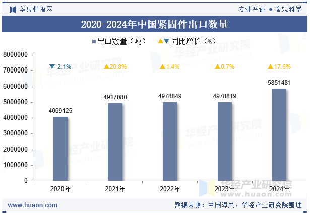 華經(jīng)產(chǎn)業(yè)研究院數(shù)據(jù)顯示:2024年中國緊固件出口數(shù)量為5851481噸,與2023年相比增長了872662噸,同比增長17.6%。