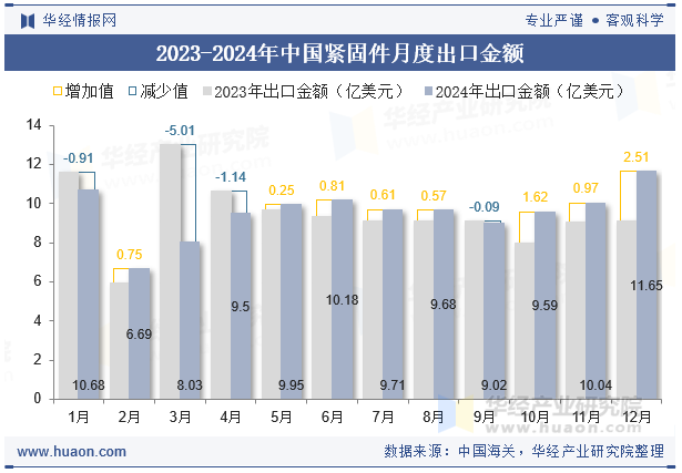 分月度來看,2024年中國緊固件出口金額于12月達到峰值,為11.65億美元,與2023年同期相比增長了2.51億美元,同比增長27.6%,去年同期出口金額為9.14億美元,累計到2024年12月出口金額為114.54億美元,累計同比增長3.3%。