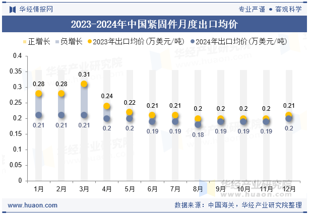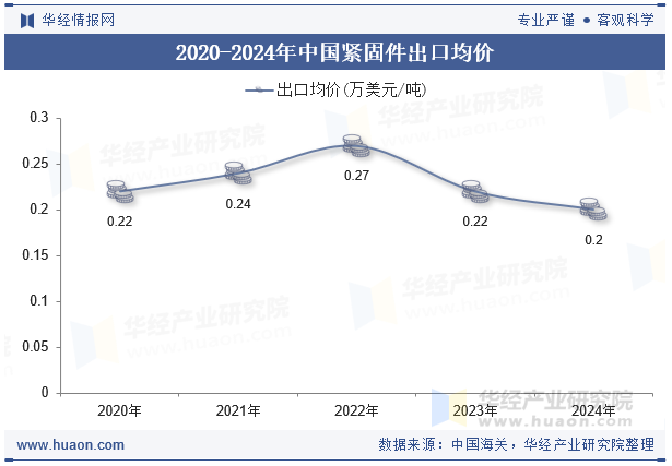 2024年中國緊固件出口均價為0.2萬美元/噸,與2023年相比減少了0.02萬美元/噸,2023年中國緊固件出口均價為0.22萬美元/噸。
